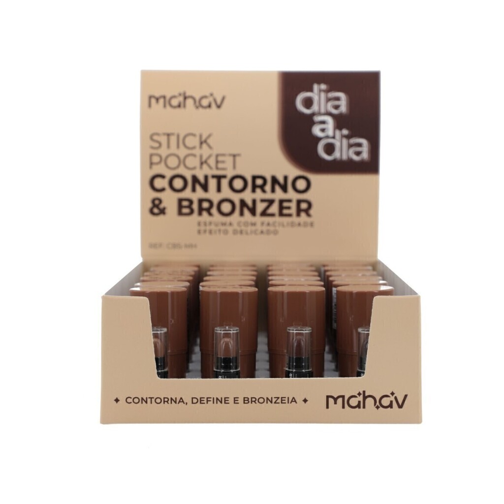 CONTORNO E BRONZER STICK DIA A DIA MAHAV — Este stick em bastão reúne duas funções essenciais para o rosto: contorno e bronzer, em uma fórmula cremosa de textura suave e aveludada que desliza facilmente sobre a pele, permitindo tanto a definição dos traços quanto um bronzeado natural e saudável; sua praticidade se evidencia pela aplicação direta, podendo ser esfumado com os dedos ou um pincel, e ainda permite construção de camadas para maior intensidade — além disso, as tonalidades quentes (como Caramel e Warm) funcionam bem como bronzer e as tonalidades mais frias (como Mocha e Intense) são ideais para contorno, oferecendo versatilidade e multifuncionalidade inclusive como sombra.