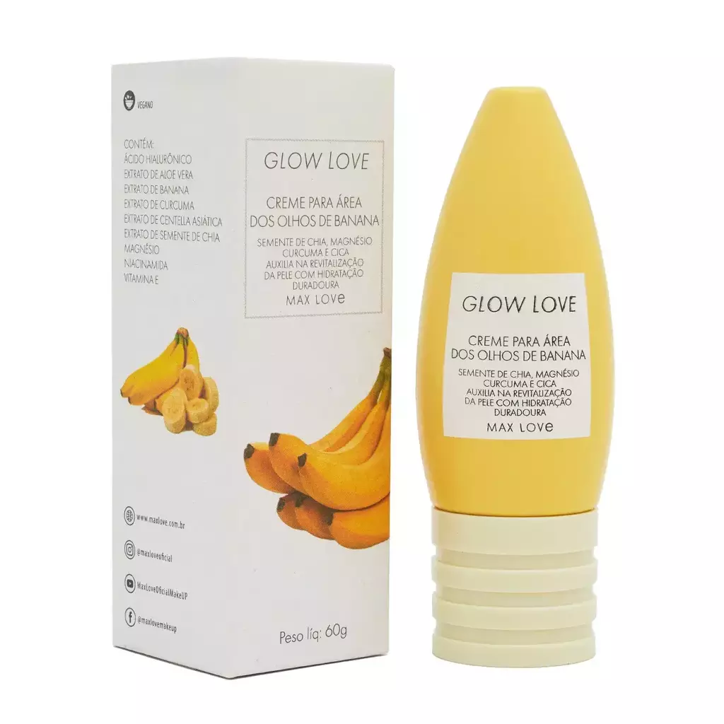 O Creme Vegano para Área dos Olhos Glow Love Banana da Max Love é um tratamento específico para a pele delicada ao redor dos olhos. Ele foi formulado para revitalizar essa região, oferecendo hidratação intensa, efeito iluminador e sensação de frescor. O creme ajuda a suavizar sinais de cansaço, reduzir olheiras, linhas finas e trazer um aspecto mais descansado ao olhar.