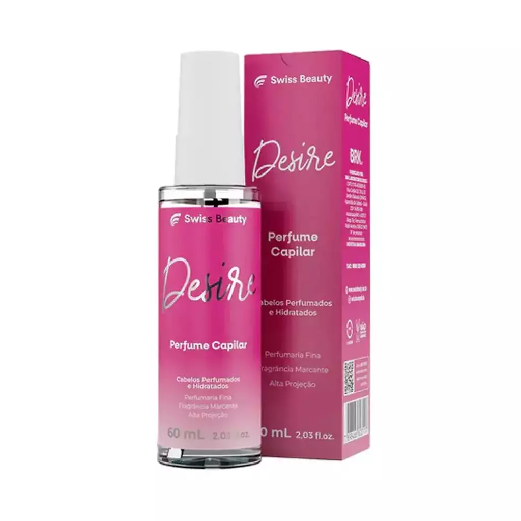 O PERFUME CAPILAR DESIRE 60ML SWISS BEAUTY oferece fragrância envolvente e duradoura para os cabelos, mantendo-os perfumados, leves e com sensação de frescor. Sua fórmula delicada não resseca os fios, sendo ideal para uso diário e proporcionando cuidado capilar com toque sofisticado e marcante.