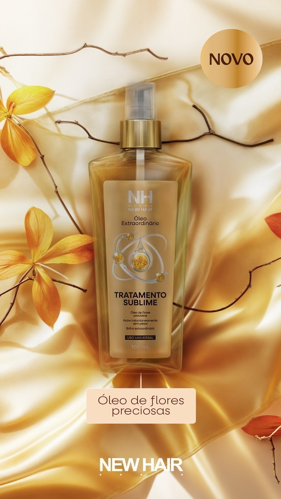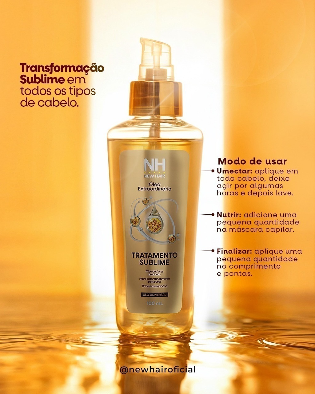 O ÓLEO EXTRAORDINÁRIO NEW HAIR é um tratamento capilar poderoso que traz um blend de óleos preciosos como flor de lótus, camomila, coco e linhaça, reforçado com vitamina E, para oferecer nutrição intensa aos fios. Ele ajuda a controlar o frizz, realça o brilho, promove maciez e fortalece os cabelos, seja usado na umectação, como finalizador ou misturado à máscara de tratamento. Sua fórmula leve é absorvida facilmente, deixando os fios sedosos, revitalizados e protegidos contra agressões externas.