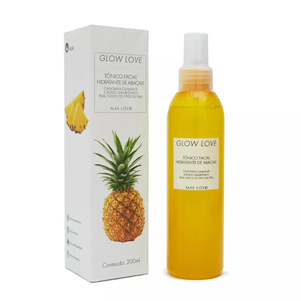 TÔNICO FACIAL GLOW LOVE ABACAXI 200ML MAX LOVE é o toque refrescante que a sua pele precisa! Enriquecido com extrato de abacaxi, conhecido por suas propriedades revitalizantes e iluminadoras, ele ajuda a tonificar, equilibrar o pH da pele e remover as impurezas sem ressecar. Sua fórmula suave e cheia de frescor proporciona hidratação leve, auxiliando na renovação celular e deixando a pele com um glow natural e aparência saudável. Ideal para todos os tipos de pele, é perfeito para finalizar a limpeza e preparar o rosto para os próximos passos da rotina de skincare.